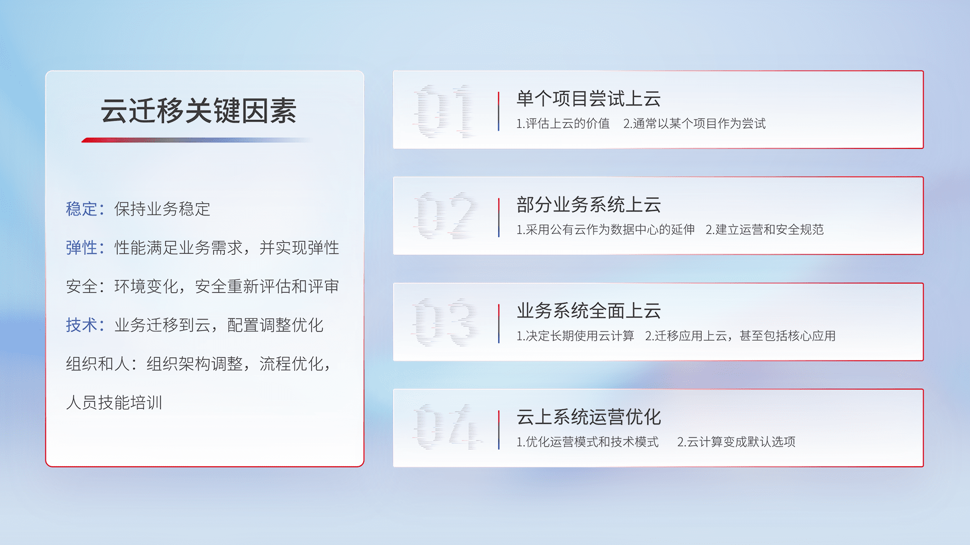 结合实际业务,,从规划设计、、云平台选型、、、云原生改造、、、、数据迁移、、、、集成交付,,迁移全过程为客户识别最佳上云路径,,,做好风险识别管理,,,,设计网络架构、、、身份权限、、、安全审计合规、、、、操作审计、、、日志审计、、监控告警策略、、多站点容灾设计等,,,对云上基础设施进行整体规划,,,提升IT治理水平,,,以满足弹性、、、高可用、、高性能的需求。。。。