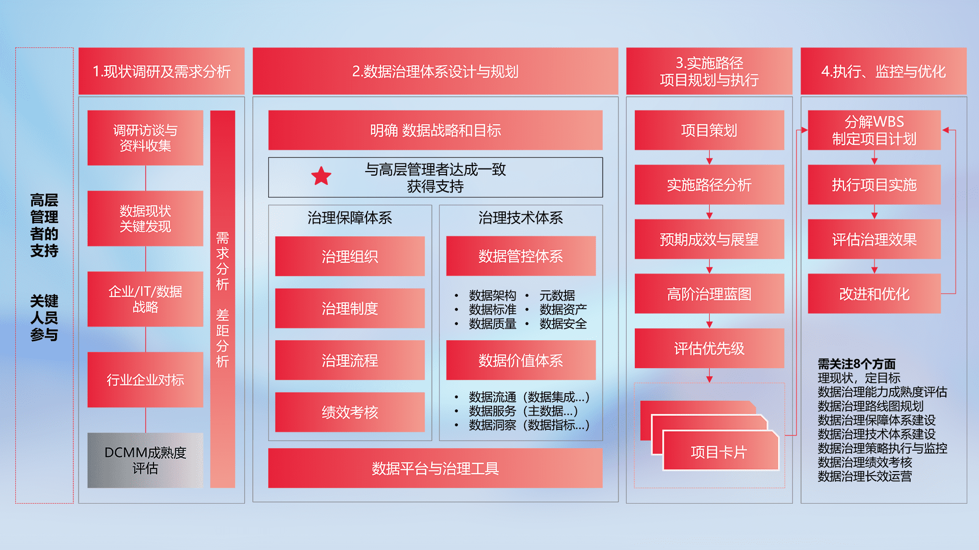 制定并执行统一的数据标准,,规范数据定义和格式,,,消除冗余和不一致性,,,,实现跨部门和跨系统的数据一致性,,,为企业提供标准化的数据基础。。